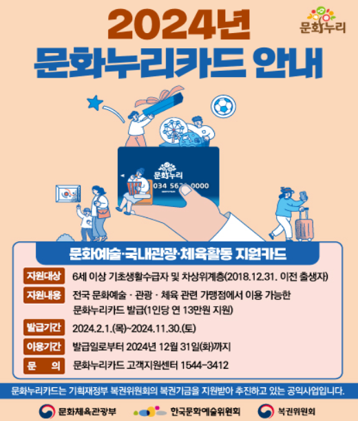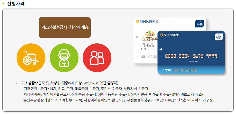 문화누리카드는 기초생활수급자 및 차상위계층을 대상으로 발급됩니다.