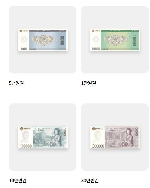 롯데상품권은 종이형과 카드형으로 나뉘며, 구입 시 일정 금액을 미리 지불하고 그 금액을 해당 상품권에 충전해주는 방식입니다.