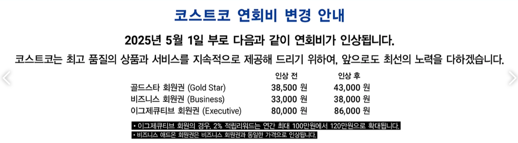 연회비 인상률을 보면 골드 스타 회원은 약 14.3%, 이그제큐티브 회원은 약 14.3%, 15% 정도 인상됩니다.