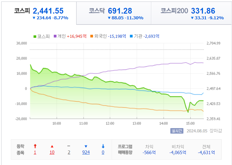 2024년 8월 5일 우리나라 증권시장인 코스피와 코스닥이 8% 넘게 하락하면서 서킷브레이커 및 사이드카가 발동되었습니다.