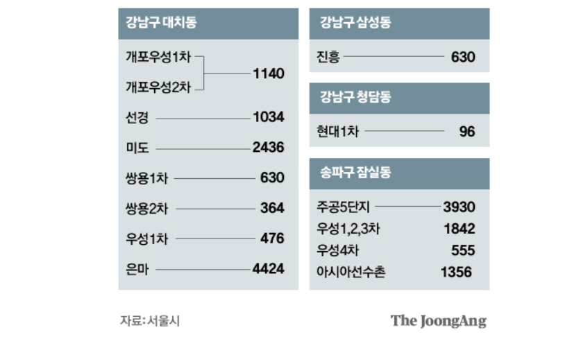 강남구: 삼성동, 대치동, 청담동 일부 아파트 단지