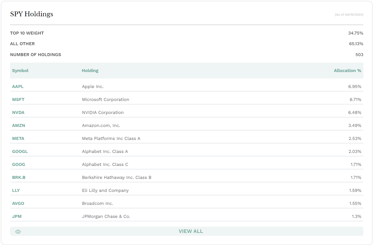 2024년 8월 현재 가장 많은 보유 비중을 차지하고 있는 기업은 6.95%의 애플이며 그 뒤로 마이크로소프트, 앤비디아, 아마존 등이 있습니다.