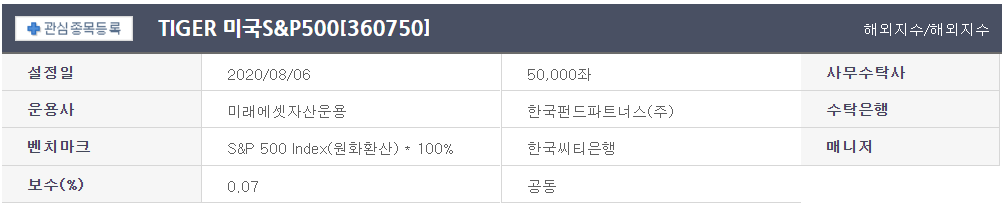 - 1. TIGER S&P500: 미래에셋 자산운용 / 수수료: 0.07%