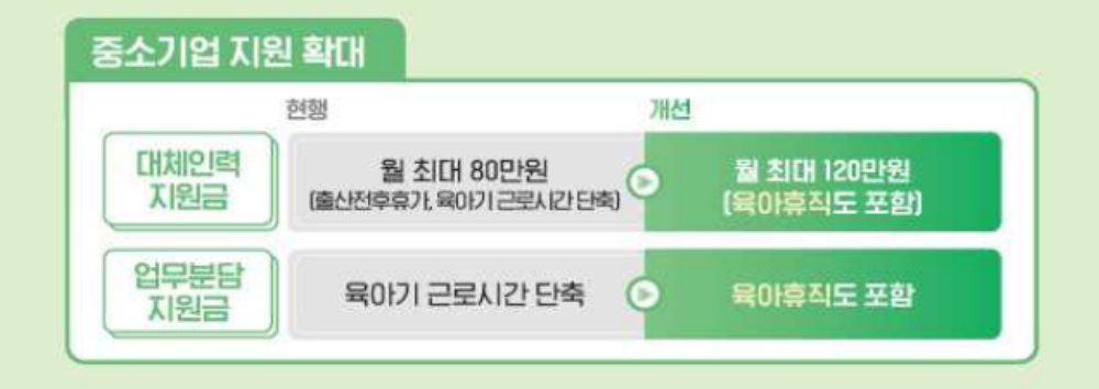 육아휴직으로 인한 업무 공백을 보완하기 위해 대체인력 지원금이 기존 월 80만 원에서 120만 원으로 인상됩니다.