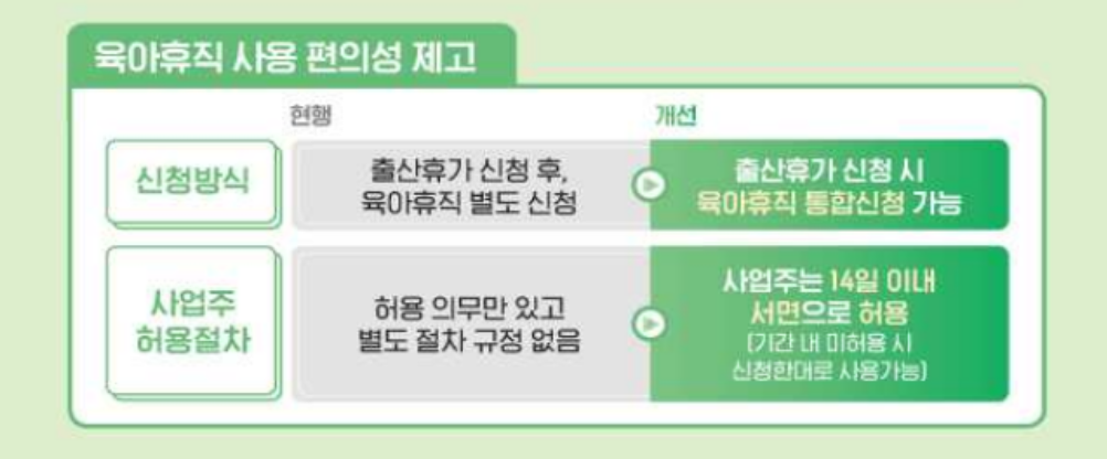 출산휴가와 배우자 출산 휴가를 사용한 후 별도로 육아휴직을 신청하는 절차를 간소화하여, 출산휴가 신청 시 함께 육아휴직을 신청할 수 있도록 개선됩니다.