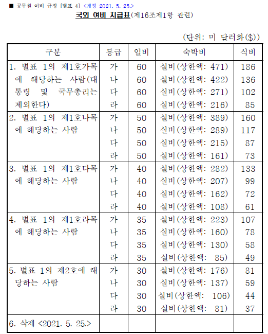 국외 여행자의 경우 아래 사진의 별표 4에 따라 지급되며, 부득이한 사정으로 초과 지출이 발생할 경우 일부 추가 지급이 허용됩니다.