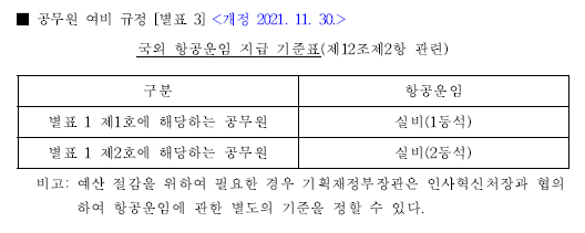 최상 등급 기준: 공무상 필요한 경우, 항공기의 최상 등급 좌석을 이용할 수 있으며, 그에 따라 운임이 지급됩니다.